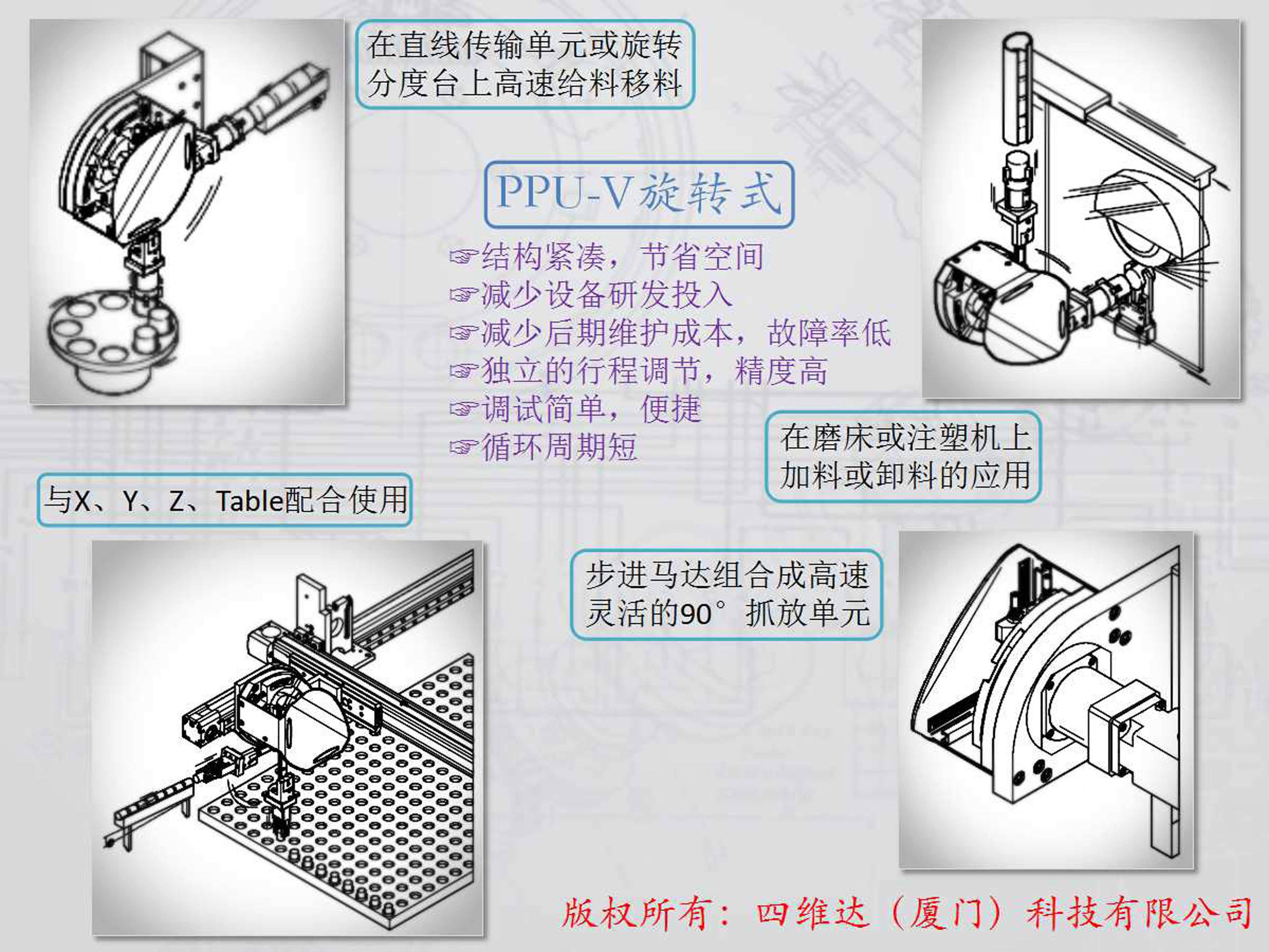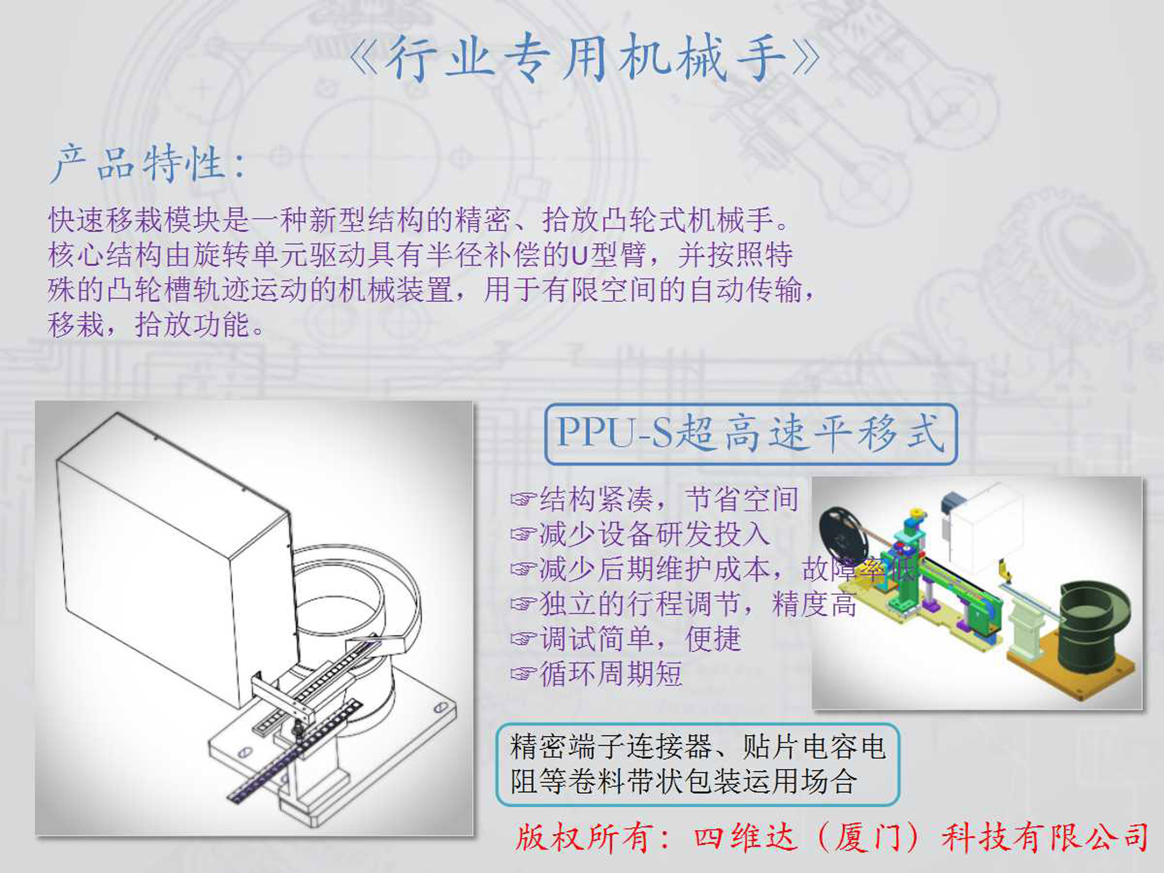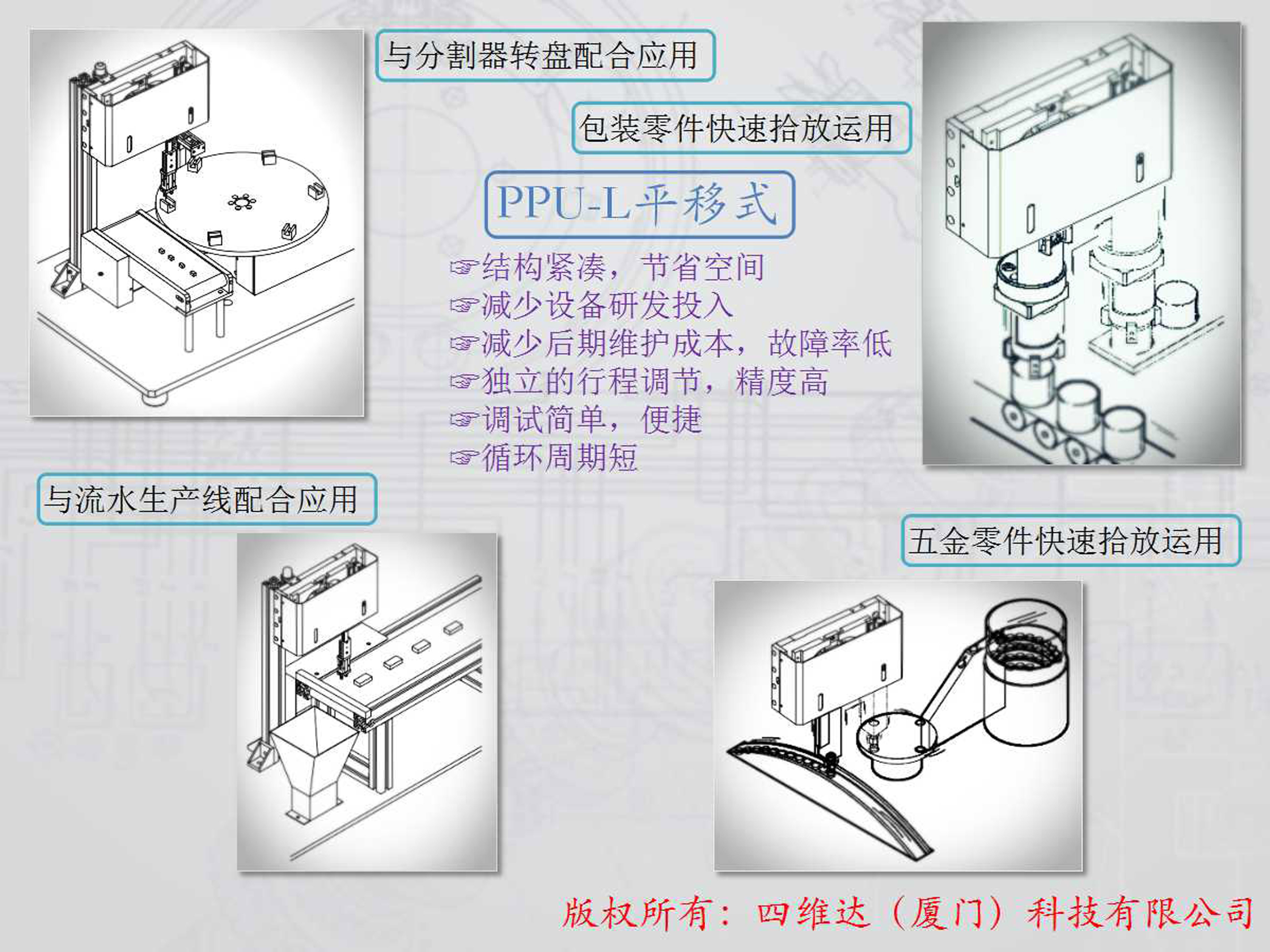 公司只專(zhuān)注于設計研發(fā),把握“工業(yè)4.0”的概念,以數字化、網(wǎng)絡(luò )化、智能化為核心,致力于實(shí)現高度集成和深度融合的自動(dòng)化成套生產(chǎn)線(xiàn)。以“科技型企業(yè)”為發(fā)展方向,努力構建在行業(yè)內具有競爭力的研發(fā)團隊,以企業(yè)的根本需求為出發(fā)點(diǎn),充分發(fā)揮公司科技人才的聰明才智,確實(shí)為企業(yè)降低運營(yíng)成本、提高制造效率;本著(zhù)“以遠見(jiàn)、贏(yíng)未來(lái)”的經(jīng)營(yíng)理念,執著(zhù)于自動(dòng)化設備的研發(fā),現公司自有實(shí)用新型專(zhuān)利32項,發(fā)明專(zhuān)利14項;廣泛應用于自動(dòng)化設備行業(yè),并提供多樣化專(zhuān)用機械手及輔助配件,承接國內知名企業(yè)新建、技改項目,為客戶(hù)提供可靠解決方案,深得客戶(hù)認可;